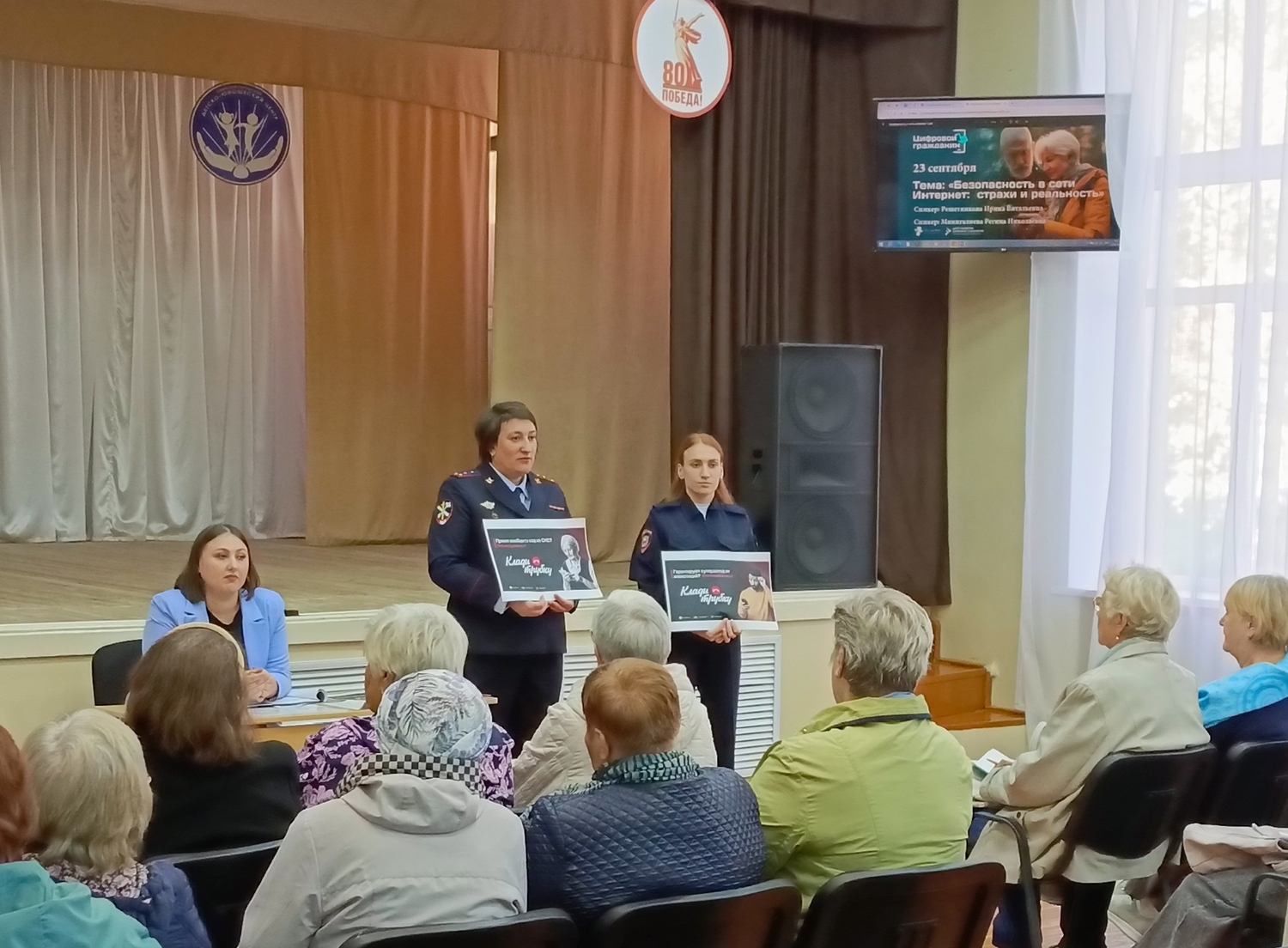 Сегодня в Ашинском городском детско-юношеском центре в рамках профилактической акции «День против мошенников» юрисконсульт правового направления ОМВД России по Ашинскому району капитан внутренней службы Лариса Плотникова и оперуполномоченный отдела уголовного розыска Екатерина Попёнова совместно с представителем Общественного совета при ОМВД Антониной Миногиной приняли участие в программе интенсива «Цифровой гражданин», организованной управлением социальной защиты населения администрации Ашинского муниципального района для лиц пожилого возраста.