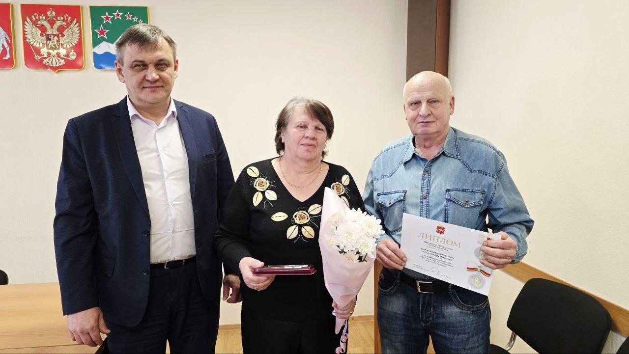Глава администрации Ашинского муниципального округа Сергеев В.Е. торжественно вручил знаки отличия семьям Галкиных - Анатолию Сергеевичу и Ире Петровне, а также Деулиным - Александру Геннадьевичу и Людмиле Сергеевне, стаж семейной жизни которых составляет 50 лет.
