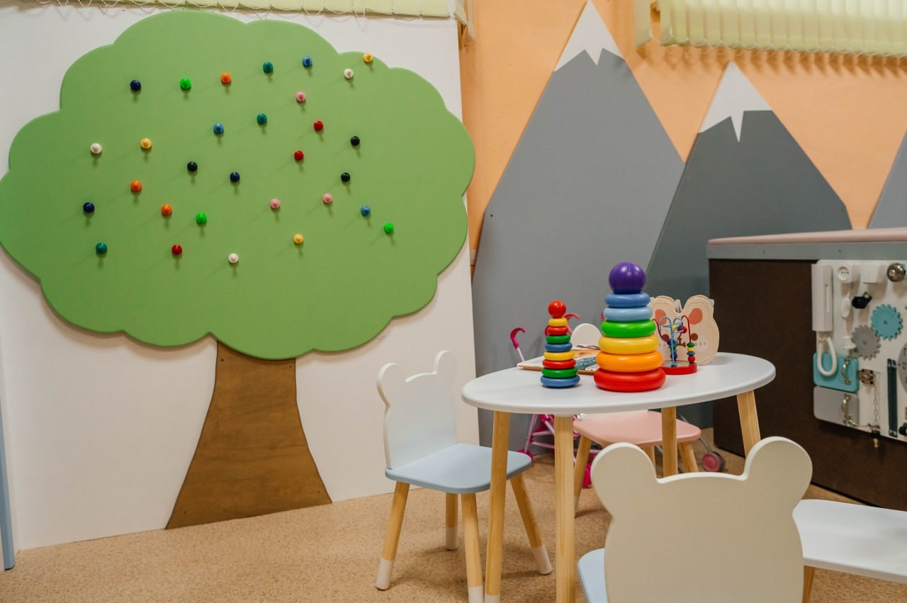 Здесь есть всё для комфорта ребят и их родителей: игрушки, телевизор, удобный диван и развивающие пособия.