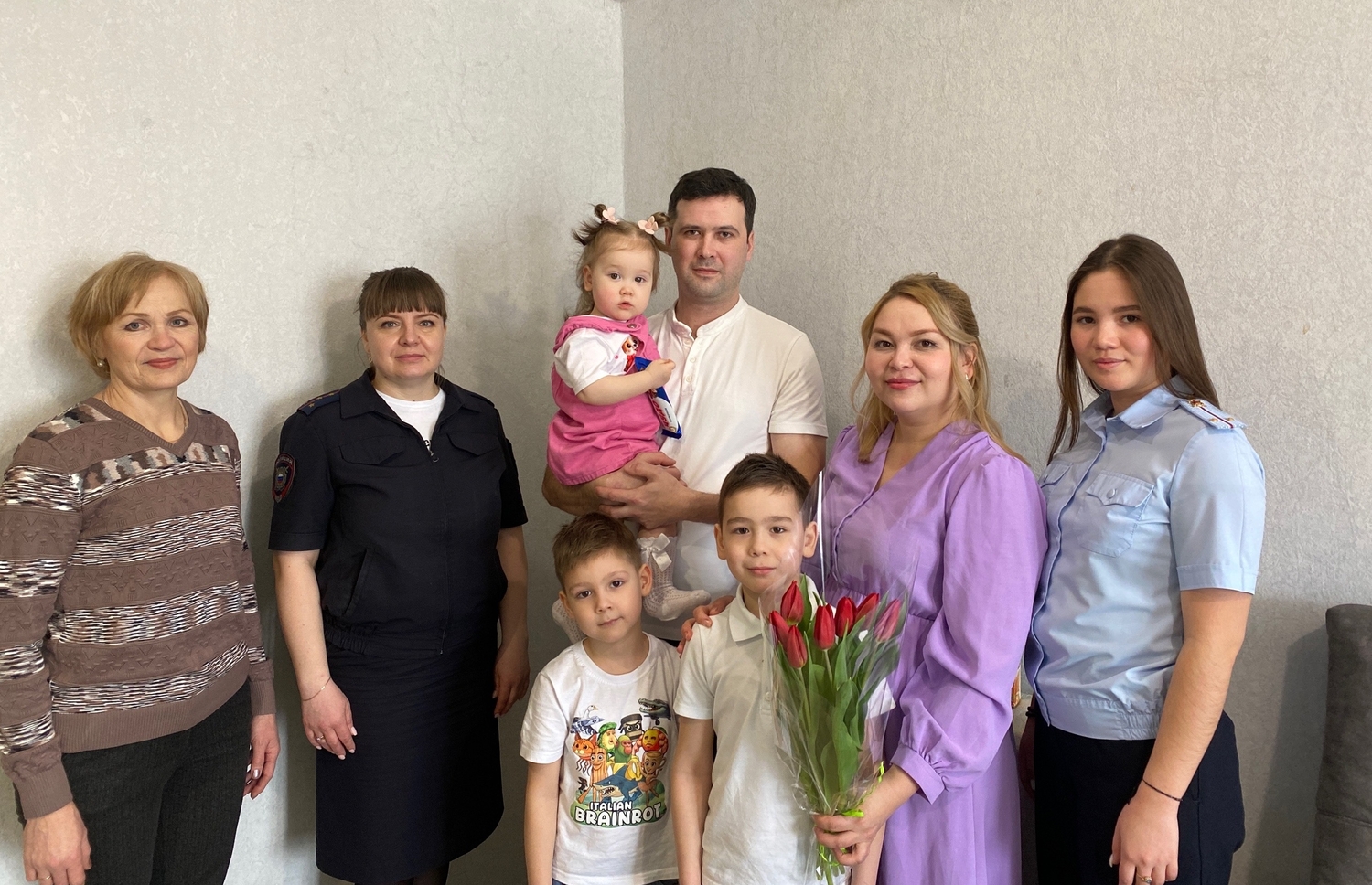 Сотрудники Отдела МВД России по Ашинскому району: старший психолог ОРЛС майор полиции Евгения Савкина, специалист группы кадров ОРЛС лейтенант полиции Дарина Хуснутдинова совместно с председателем Совета ветеранов и представителем Общественного совета при ОМВД Антониной Миногиной на дому поздравили многодетную маму – инспектора по пропаганде безопасности дорожного движения отдела Госавтоинспекции старшего лейтенанта полиции Гульшат Муфтееву с наступающим праздником 8 Марта.